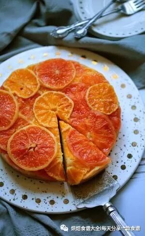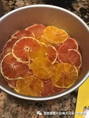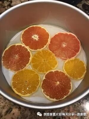 3.取一半3中的糖浆倒在烤盘里,再铺上橙子片,记得要让比较好看的橙子放在最底层,这样翻过来的时候才能被看到。