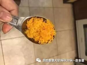 5.取一个橙子,用刨丝器擦出橙子皮屑,挤出橙子汁。橙子汁需要三勺,橙子皮屑需要一勺。(见小贴士2)