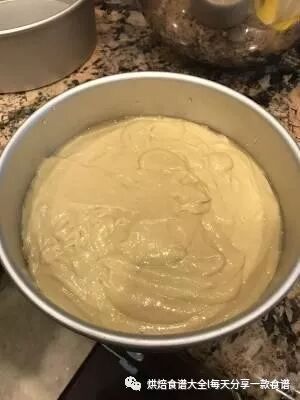 8.此时烤箱已经预热好了。把蛋糕糊倒到橙子上面,铺平。放入烤箱中层。烤大约35分钟。用烘焙手套背面拍一拍蛋糕,如果听到沙沙声就是还没烤好,如果是彭彭声就是好了。